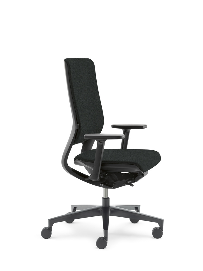 Der Bürostuhl Mera von Klöber hat ein zeitloses Design, welches an alle Anforderungen angepasst werden kann. Ob im Chefbüro, im Mitarbeiterbüro oder am Empfang - der Mera macht stets eine gute Figur und sorgt dabei für ein angenehmes und gesundes Sitzgefühl. Die weiche Polsterung der Sitzes und der Rückenlehne sorgen für einen hohen Komfort, der integrierte Sitzkeil dient einer aufrechten Sitzhaltung. Die Bildung eines Rundrückens wird damit vermieden. Beide sind mit hochwertigen schwarzen Bezügen bespannt. Mittels der Synchronmechanik werden der Sitz und die Rückenlehne immer in einem optimalen Winkel zueinander gehalten, sodass der Drehstuhl ergonomisch ist, auch wenn Sie sich an einem langen Arbeitstag einmal zurücklehnen. Schöpfen Sie einfach entspannt neue Kraft und starten Sie anschließend mit neuen Ideen durch.