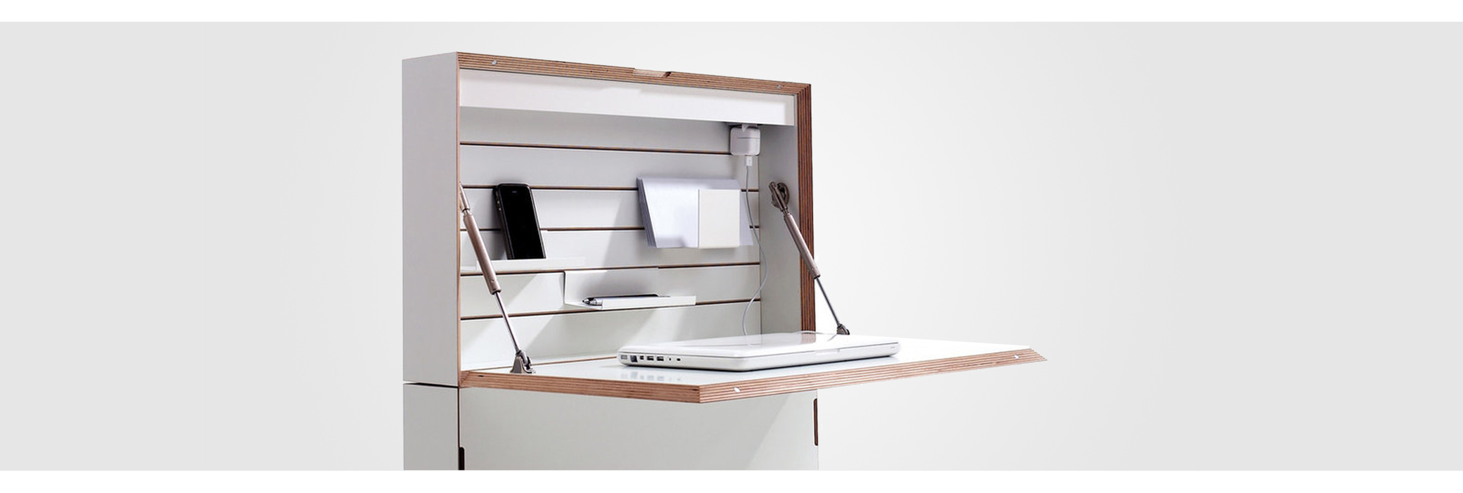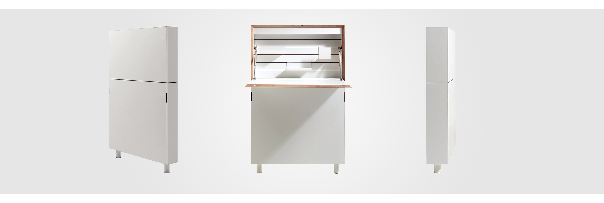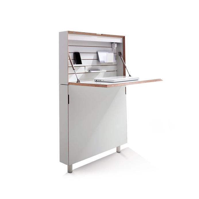 Der Flatmate Sekretär von Müller Möbelwerkstätten zeichnet sich durch sein extrem raumsparendes Design aus. Trotz seiner Tiefe von gerade einmal 122 mm bietet er ein Maximum an Funktionalität. Die eingebaute Beleuchtung, Stauraum für Ordner, Steckdosenleiste und praktische Ablagefächer sind nur einige der Highlights. Designer Michael Hilgers entwirft mit dem Flatmate Sekretär ein echtes Meisterwerk und ist mit seinen platzsparenden und gleichzeitig funktionalen Möbeln am Puls der Zeit.