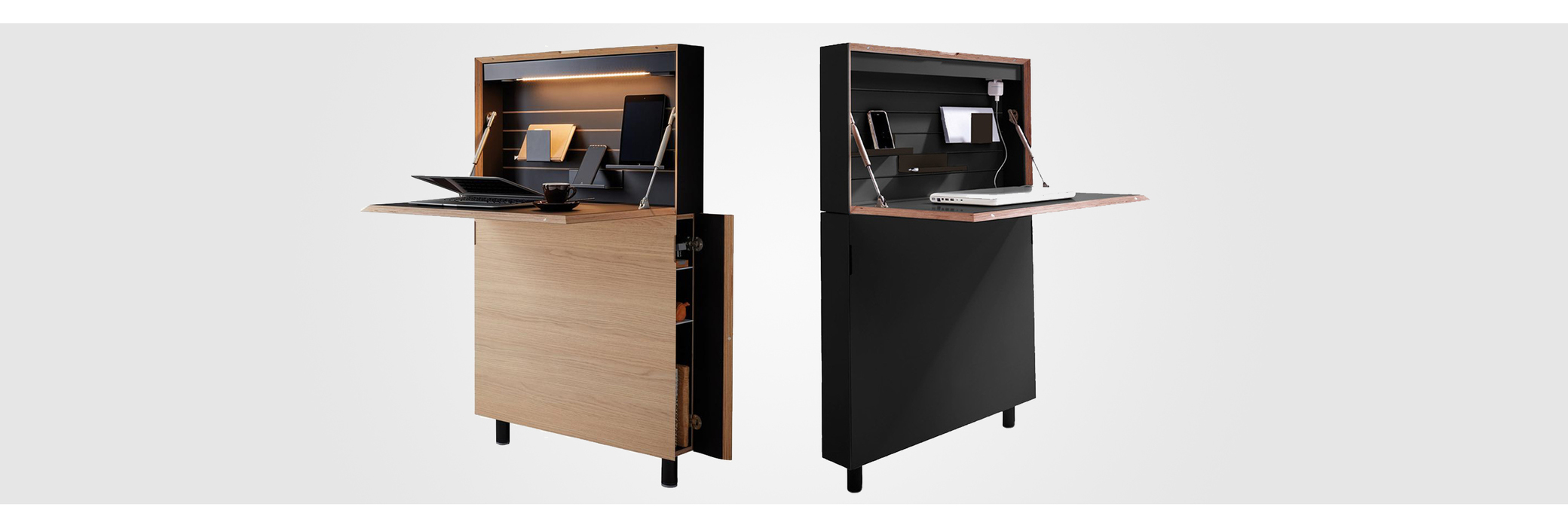 Die integrierte flexible Innenausstattung mit Ablagemöglichkeiten für traditionelle Schreibgeräte sowie Tablet-PC und Co. verbindet Merkmale eines klassischen Möbels mit der neuen Form des vernetzten Lebens und Arbeitens. Ergänzt durch eine Bluetooth-Tastatur (nicht im Lieferumfang erhältlich) wird so aus dem mobilen Tablet-PC ein stationärer ergonomischer Arbeitsplatz mit integrierter Stromversorgung; das Mobiltelefon lässt sich so aufladen. Die blendfreie Beleuchtung sowie die unsichtbare Steckdose werden durch das elegante 1,30 Meter lange schwarze Textilkabel in Funktion gesetzt.