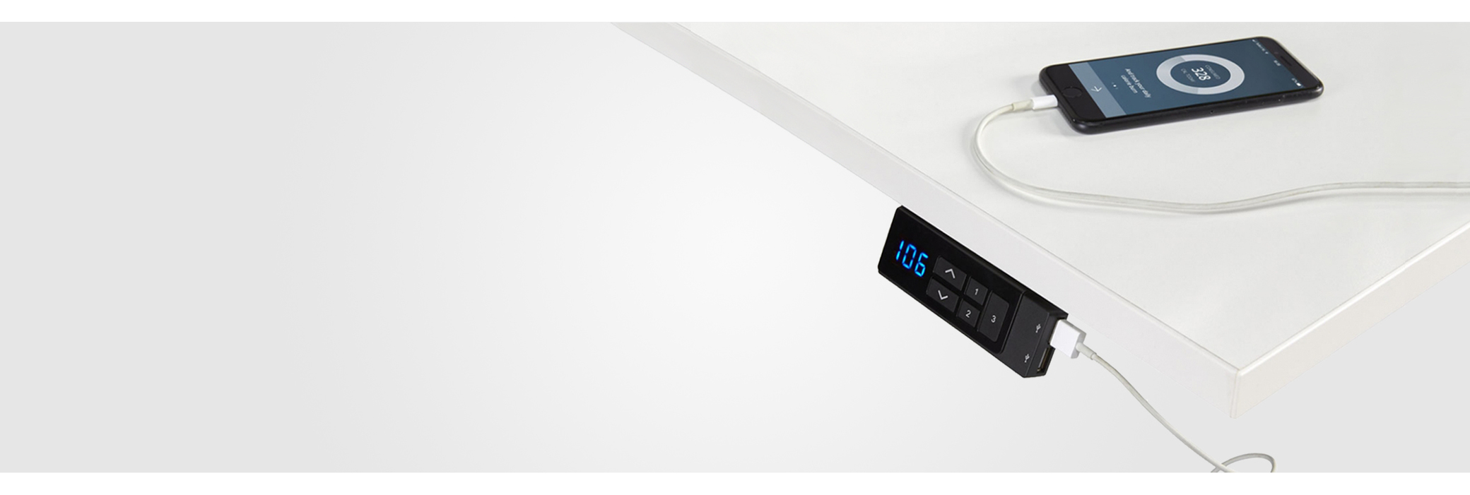 Um Rückenschmerzen vorzubeugen, empfehlen Mediziner, pro Stunde rund 15 Minuten im Stehen zu arbeiten. Mit dem Up ist das kein Problem: Elektromotorisch per Knopfdruck kann das Schreibtisch schnell hoch- bzw. runtergefahren werden. Über die Displayanzeige kann die richtige Höhe genau eingestellt werden. Der Handschalter verfügt darüber hinaus über Speicherfunktionen. Der Tisch ist smart und lässt sich über Bluetooth steuern. Die App erinnert einem an den Wechsel und zählt dabei den Kalorienverbauch.