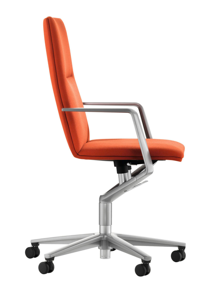 Der Konferenzsessel Sola steht ganz in der Tradition von Wilkhahn, innovativen Sitzkomfort mit einer klaren Formensprache und hochwertiger Anmutung zu verbinden. Die Ästhetik des Sessels wird durch die geradlinige Geometrie der Sitzschale und durch die markante Linienführung des Aluminiumgestells geprägt, das von der Mittelsäule in einen V-förmigen Träger übergeht, dessen Enden wiederum in den Armlehnen münden. Der besondere Clou: Die Sitzschale ist vorne drehbar gelagert und im hinteren Bereich durch zwei Druckfedern mit dem V-Träger verbunden. Dadurch entsteht ein dynamisch wippender, individuell einstellbarer Federkomfort. Neben der klaren Formensprache und der ablesbaren Wipp-Funktion überzeugt die hochwertige Verarbeitung der Polster. Auf die rückseitig bezogene Formholzschale ist das Polster wie ein Kissen aufgedoppelt, sodass eine feine, umlaufende Fuge entsteht. Sie lässt den ohnehin schlanken Querschnitt noch filigraner erscheinen.