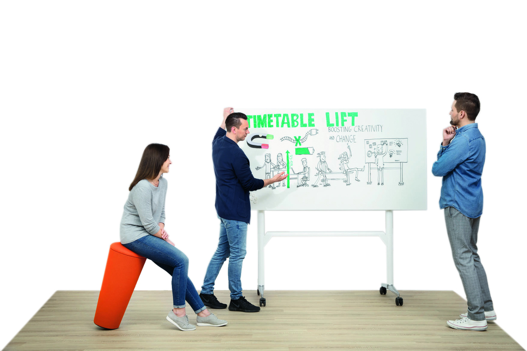 So lässt sich das gemeinsam Erarbeitete im Handumdrehen dokumentieren und präsentieren. In dieser Ausführung wird der Timetable Lift zum universell nutzbaren Tool für Innovationsprozesse.